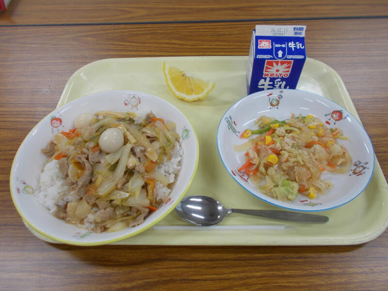 今日の給食は、中華丼、糸寒天サラダ、はるか、牛乳でした。