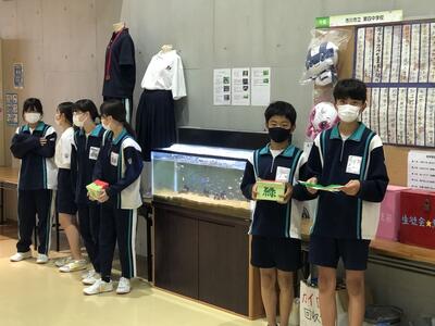 6月6日(月)から9日(木)の間、生活委員会の活動で緑の羽根募金活動が行われています。朝から各学年の昇降口に立ち呼びかけを行っています。