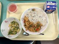 今日の献立は、チキンライスのホワイトソース添え、アスパラとコーンのサラダ、いちごゼリーです。アスパラガスには、疲労を回復する栄養素が含まれているそうです。たくさん食べて連休疲れを吹き飛ばしましょう!