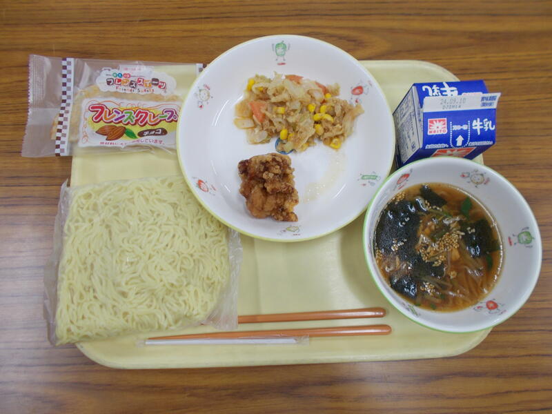 2学期の給食が今日から始まりました。給食は柏井小学校で作られていますが、牛乳はその日の朝4時30分頃に配達され冷蔵庫に保管されます。早い時間なので驚きです。おいしい牛乳が飲めるのも生産者や運送会社の人に感謝です。ちなみに今日の献立は、冷やし中華、鶏の唐揚げ、ごまドレサラダ、フレンズクレープ(チョコ味)、牛乳でした。ごちそうさまでした。