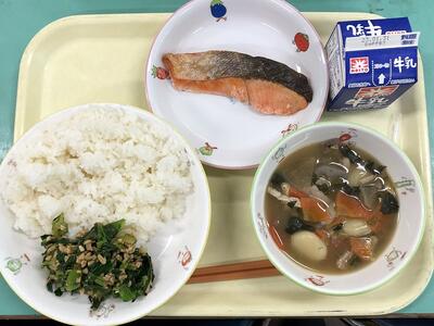 1/24~30日は、全国学校給食週間です。給食の始まりは明治22年だそうです。今日は、ご飯・のり納豆和え・さけ・すいとん・牛乳です。日本で最初の給食を再現した献立だそうです。