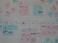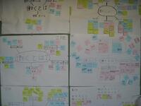 1学年の各クラスの廊下に「働くとは」について話し合われたKJ法が掲示されています。キャリア教育の一環で次に職業について学んでいきます。