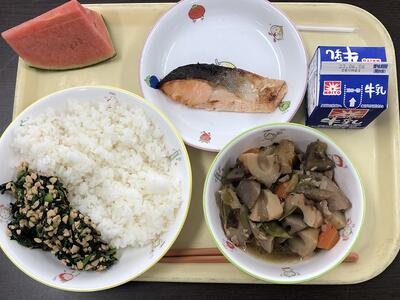 今日の献立は、ご飯、鮭の味噌マヨ焼き、納豆和え、筑前煮、すいか、牛乳でした。