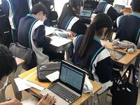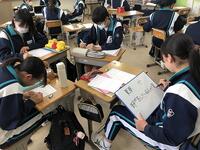 2年生の理科では、タブレットを使い単元のまとめを行っていました。3年生の国語では、ホワイトボードを使いグループの意見をまとめています。