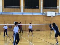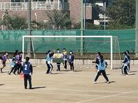 2学年の体育の様子です。体育館ではバドミントン、グランドではハンドボールが寒さに負けず元気に行われています。