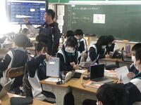 1年生の数学の授業です。三脚の足が3本の理由についてグループで話し合い、タブレットを使い意見を共有しています。