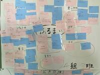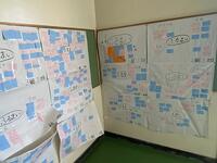 2棟の階段には、先日実施したイエローリボン運動で「ふるまい」について話し合ったKJ法の図が全班分掲示されています。