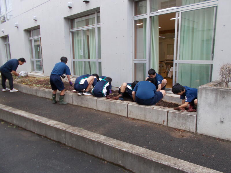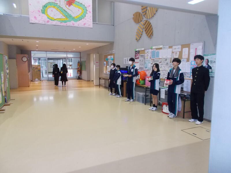 朝、生活委員会で赤い羽根共同募金の呼びかけをしています。赤い羽根共同募金は、地域歳末たすけあい募金やNHK歳末たすけあい募金と同じように、地域の福祉活動に使われています。