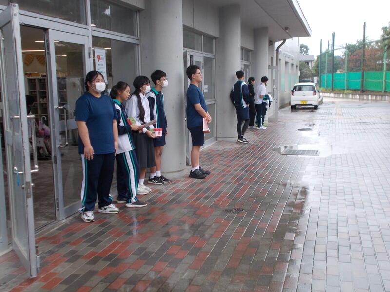 昨日に引き続き、生活委員会が赤い羽根共同募金の呼びかけを雨の中行いました。