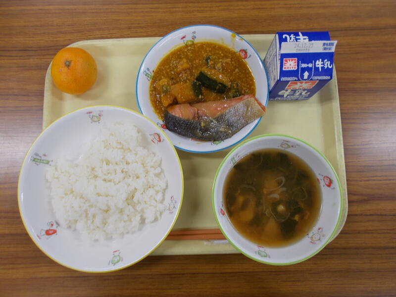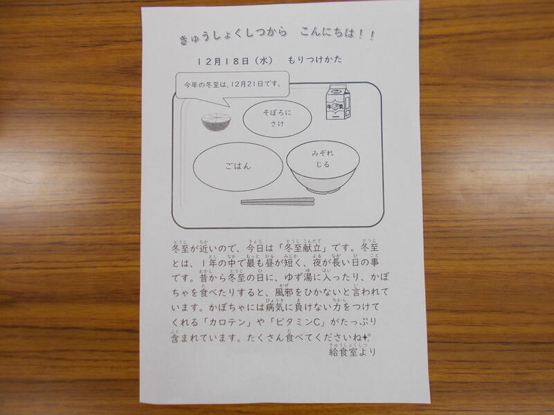 冬至が近くなってきました。今日メニューは、鮭のゆず味噌がけ、かぼちゃのそぼろ煮、みぞれ汁、ごはん、みかん、牛乳でした。ゆずやかぼちゃは、冬至には欠かせませんね。おいしくいただきました。