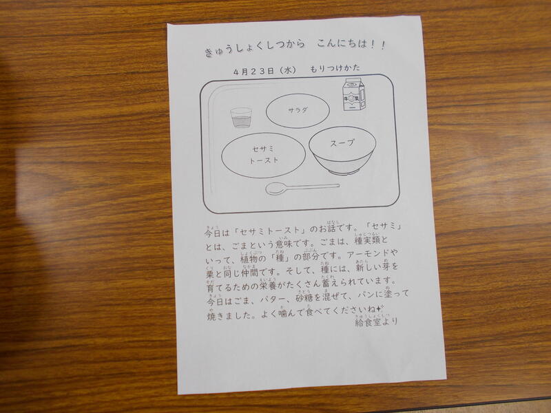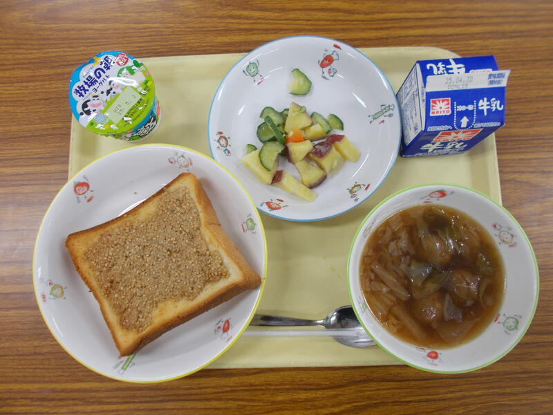 今日の給食は、セサミトースト、さつまいもサラダ、肉団子スープ、ヨーグルト、牛乳でした。
