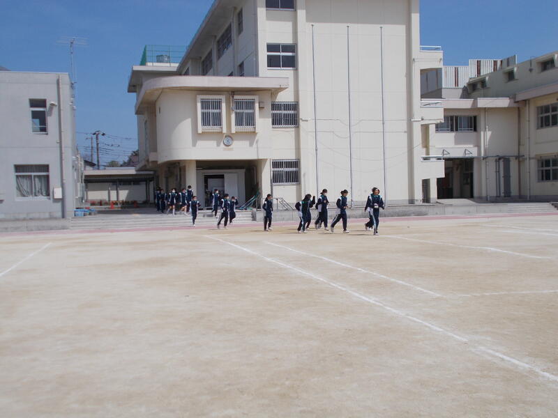 地震が起きた時、自分の身を守り、校庭に避難です。