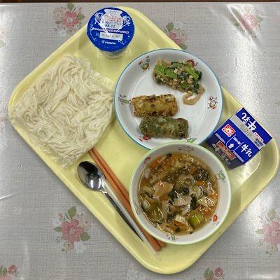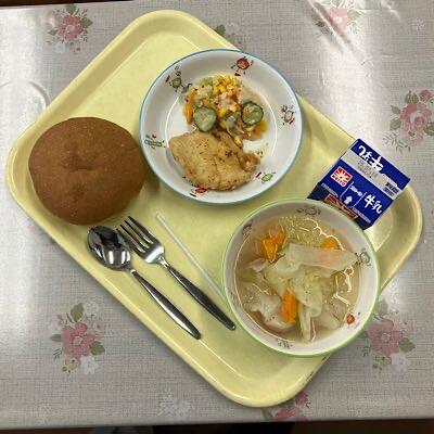 今日の献立は、ごはん、牛乳、秋鮭のチャンチャン焼き、車麩の煮物、ひとくちゼリーです。