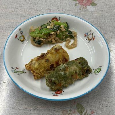 白身魚のごまからめ おひたし 筑前煮 牛乳