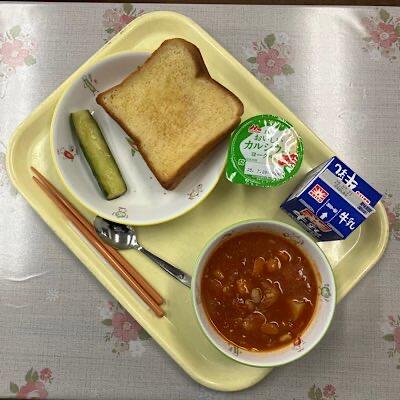 チリコンカン かぶサラダ おさつトースト 牛乳