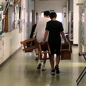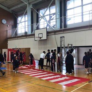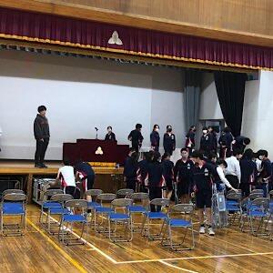 男子バスケ部が入学式保護者席に使ったイスを片付けています