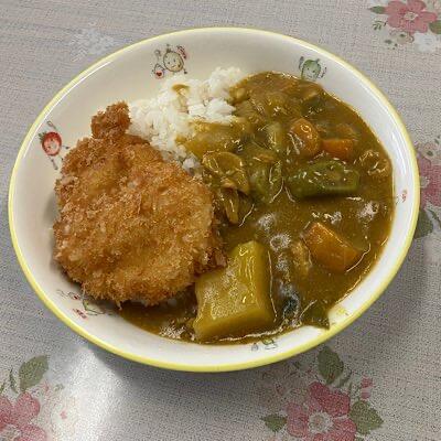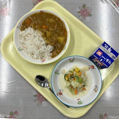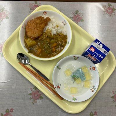 夏野菜カレー 麦ごはん チキンカツ サイダーゼリーポンチ 牛乳
