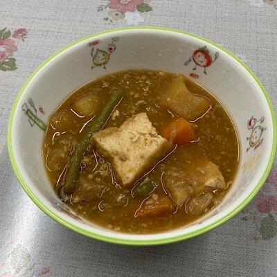 トマトベースの洋風煮物 豚肉、ジャガイモ、タマネギ、ニンジン、お豆の具材で賑やかな味わい