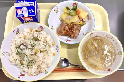 今日の献立は、コーンピラフ、鶏肉のバーベキューソース、ポテトサラダ、オニオンスープ、牛乳です。