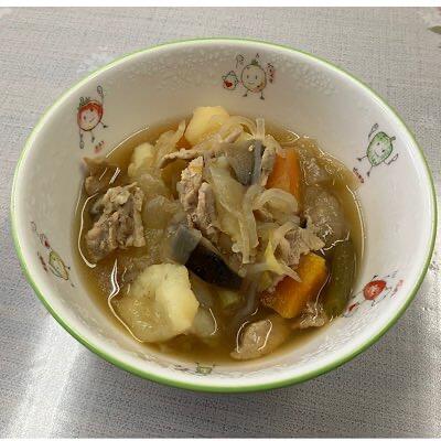 鶏肉、小松菜、にんじん、コーンの春雨スープ
