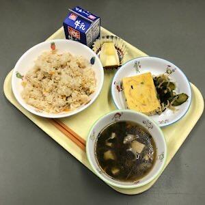 たけのこごはん 玉子の唐草焼き 酢の物 沢煮椀 りんご