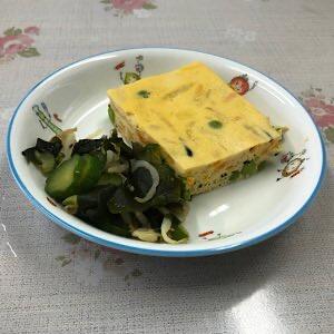 鶏肉、ひじき、にんじん、玉ねぎ、グリーンピース入りの唐草焼き
