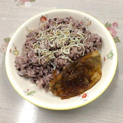 しいらの竜田揚げ、青菜の炒め煮、豚汁、ごはん、牛乳