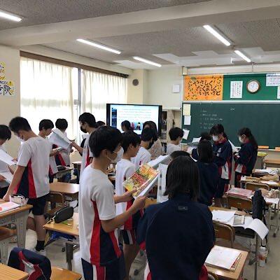 一学年教室で、海外から来た転入生の歓迎セレモニーをしています