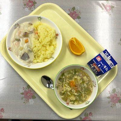 ホイコーロー、ワンタンスープ、ごはん、牛乳、杏仁豆腐