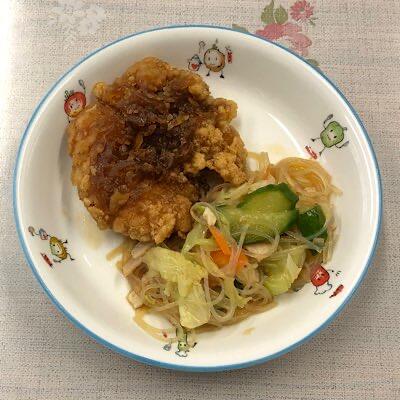 鶏肉の油淋鶏風 春雨サラダ 中華スープ ごはん 牛乳