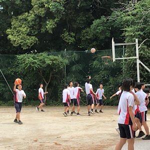 中庭とグランドで、大勢が、スポーツ遊びをしています