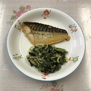 さばの塩こうじ焼き ごま和え インド煮 黒糖ビーンズ ごはん 牛乳