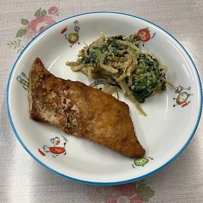 豚肉のかりん揚げ からし和え ごはん けんちん汁 牛乳