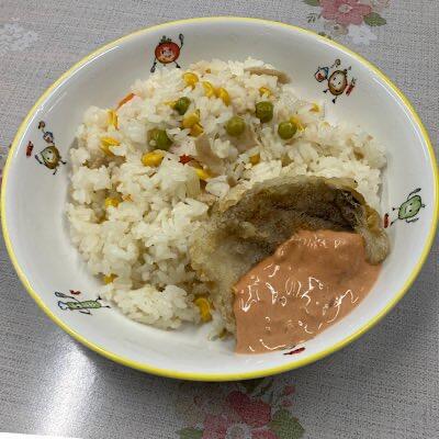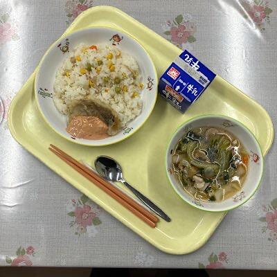 ハムピラフ 白身魚のオーロラソース 野菜スープ 牛乳