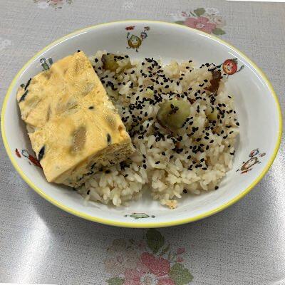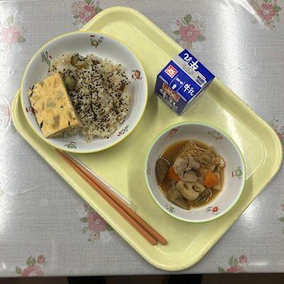 さつまいもごはん 卵の唐草焼き 厚揚げ根菜煮 牛乳