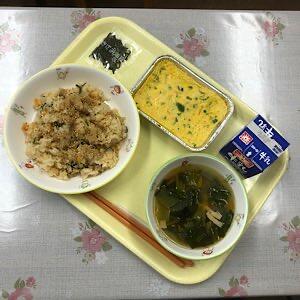 キンパ風ごはん ケランマリ(韓国風玉子焼き) わかめスープ 牛乳
