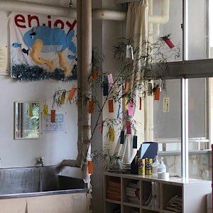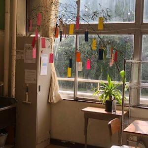 校長室前に続き、あちこちの教室で七夕飾りが出ています