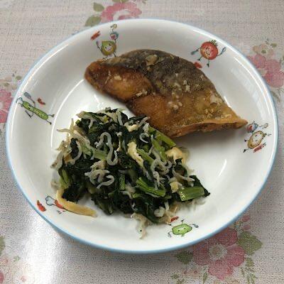 冷やしうどん 天ぷら(きす かぼちゃ) なすと豚肉の炒め物 お麩のラスク 牛乳