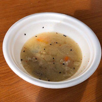 栄養豊富な具沢山スープ(春雨、鶏肉、ベーコン、しめじ、にんじん、小松菜、コーン)