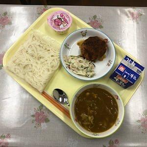 カレーうどん おからコロッケ 大根サラダ ももゼリー 牛乳