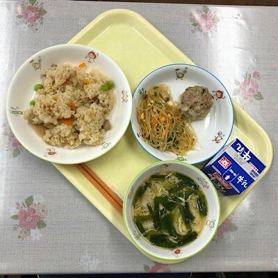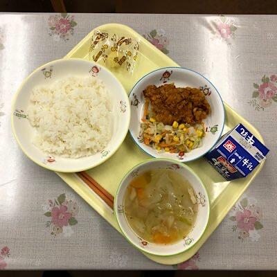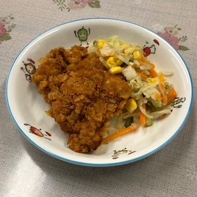 コーンフレーク揚げ ごまサラダ コンソメスープ お月見団子 牛乳