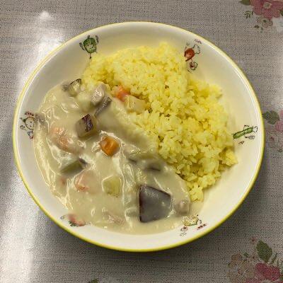 ターメリックライス クリームソース レタスとベーコンのスープ オレンジ 牛乳