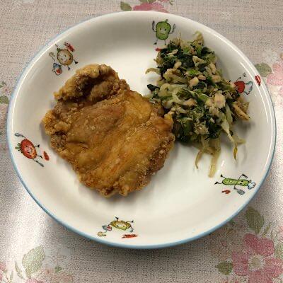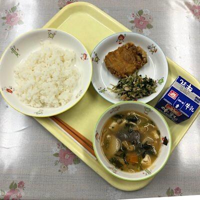 鶏のから揚げ ツナ和え みそけんちん汁 ごはん 牛乳