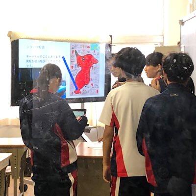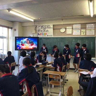 学年teams(オンライン会議)で学級代表グループのプレゼンを各教室で共有中