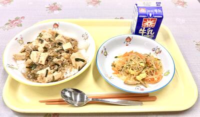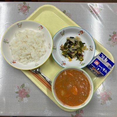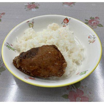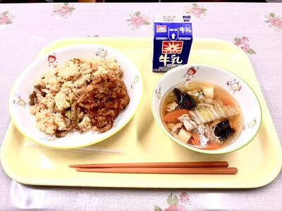 今日の献立は、牛乳、中華おこわ、鶏肉の油淋鶏風、きくらげスープです。