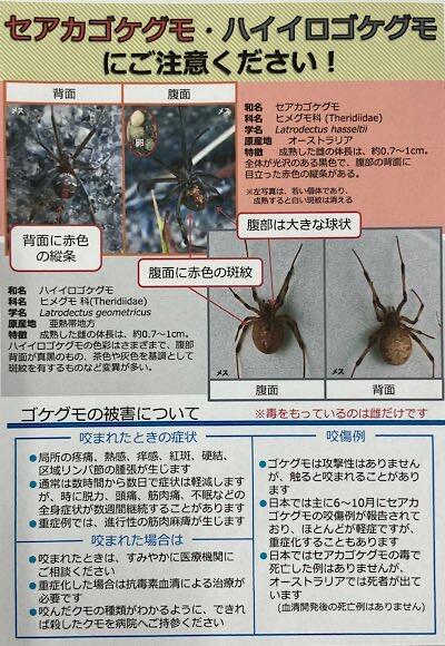 9月20日(土)に市内北部でお子さんがセアカゴケグモに咬まれる事案が発生しました