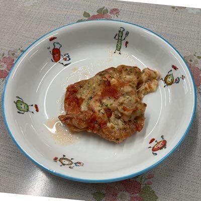 鶏もも肉にオリーブオイルベースでトマト、ニンニク、チーズを乗せてオーブンへ