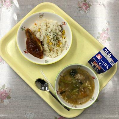 コーンピラフ 白身魚のチリソース ミートボールスープ 牛乳