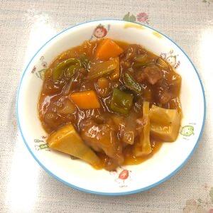 6種の野菜と鶏肉、とうふ、油揚げ、こんにゃくが入った汁もの