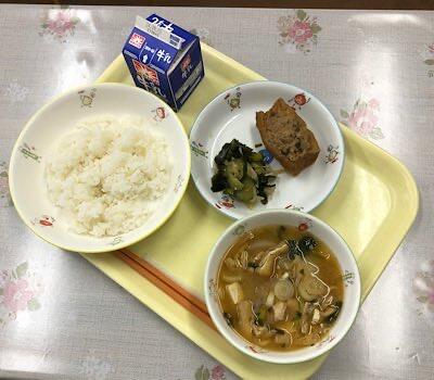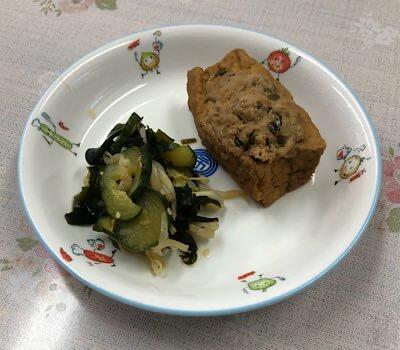 生揚げの肉詰め みそけんちん汁 酢の物 ごはん 牛乳